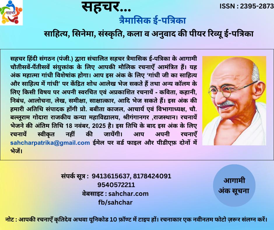 सहचर (त्रैमासिक पीयर रिव्यू ई-पत्रिका) जिसका ISSN: 2395-2873 है के आगामी अंक की सूचना सहचर हिंदी संगठन (पंजी.) द्वारा संचालित सहचर त्रैमासिक ई-पत्रिका के आगामी चौतीसवें-पैंतीसवें संयुक्तांक के लिए आपकी मौलिक रचनाएँ आमंत्रित हैं। यह अंक महात्मा गांधी विशेषांक होगा। आप इस अंक के लिए 'गांधी जी का साहित्य और साहित्य में गांधी' पर केंद्रित शोध आलेख भेज सकते हैं तथा अन्य कॉलम के लिए किसी विषय पर अपनी स्वरचित एवं अप्रकाशित रचनायें कविता, कहानी, निबंध,आलोचना,लेख,समीक्षा, साक्षात्कार,आदि भेज सकते हैं। इस अंक की अतिथि संपादक राजस्थान की प्रो. बबीता काजल होंगी। रचनायें भेजने की अंतिम तिथि 18 नवंबर, 2025 है। इसके बाद इस अंक के लिए रचनायें स्वीकृत नहीं की जायेंगी। आप अपनी रचनाएँ sahcharpatrika@gmail.com ईमेल पर वर्ड फाइल और पीडीएफ़ दोनों में भेजें। सहचर के पिछले अंक को पढ़ने के लिए आप sahchar.com देख सकते हैं । अन्य जानकारी के लिए निम्नलिखित नंबर पर संपर्क करें -- संपर्क सूत्र : 9413615637, 8178424091,9540572211 पत्रिका के व्हाट्सएप समूह से जुड़े... https://chat.whatsapp.com/BmKKKOheoKcCeHwYP2yRZ5?mode=wwt
