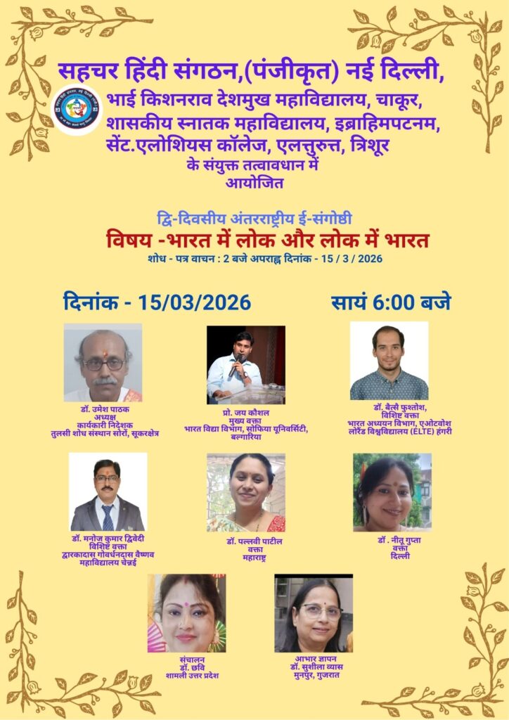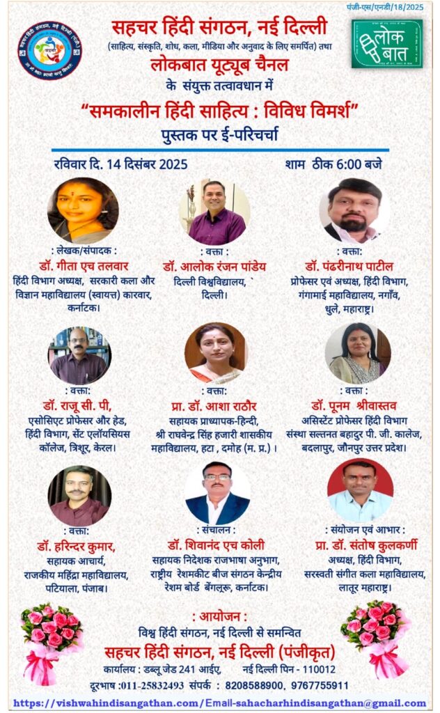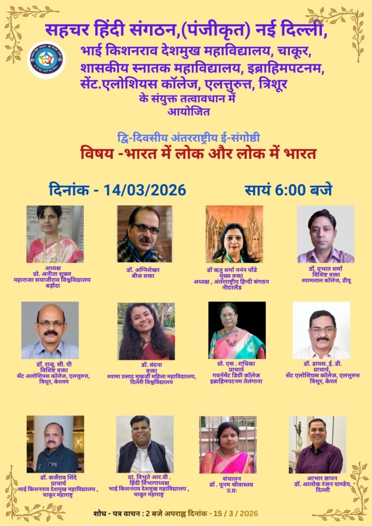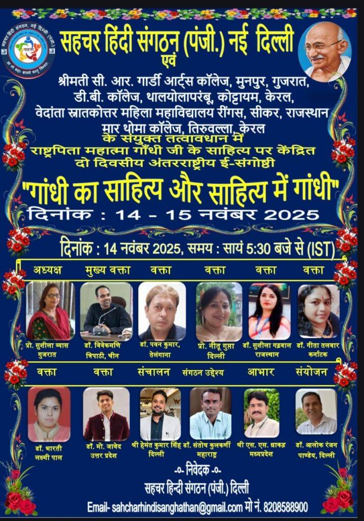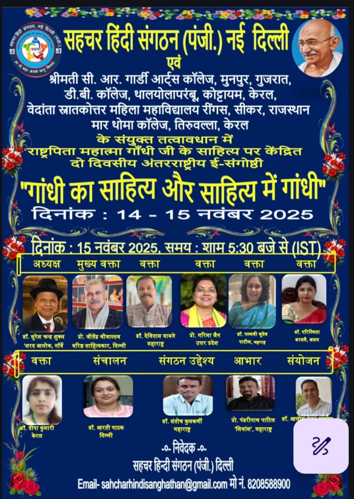 सहचर हिंदी संगठन (पंजी.) नई दिल्ली राष्ट्रपिता महात्मा गाँधी जी के साहित्य पर हिंदी विभाग, श्रीमती सी. आर. गार्डी आर्ट्स कॉलेज, मुनपुर, गुजरात; हिंदी विभाग, डी.बी. कॉलेज, थालयोलापरंबू, कोट्टायम, केरल; हिंदी विभाग, वेदांता स्नातकोत्तर महिला महाविद्यालय रींगस, सीकर, राजस्थान; और हिंदी विभाग, मार थोमा कॉलेज, तिरुवल्ला, केरल के संयुक्त तत्वावधान में "गांधी का साहित्य और साहित्य में गांधी" विषय पर दो दिवसीय अंतरराष्ट्रीय ई - संगोष्ठी का आयोजन दि. 14-15 नवंबर 2025 को ऑनलाइन कर रहा है। इस अंतरराष्ट्रीय ई- संगोष्ठी में देश विदेश के विद्वान अपने विचार रखेंगे। आप इस ई संगोष्ठी को लोकबात यूट्यूब चैनल पर लाइव सुन सकते हैं...